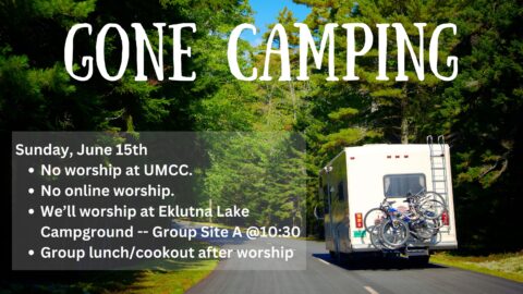 We will not be gathering at UMCC on Sunday June 15th and we will not have online worship available. We are worshipping OFF-GRID at the Eklutna Campground Group Site at 10:30 AM. We have the whole site reserved from early Friday afternoon on June 13th until noon on Monday, June 16th. That gives us all day on Saturday and Sunday for people to come out to the campground to hike or bike or boat or just sit around a campfire.