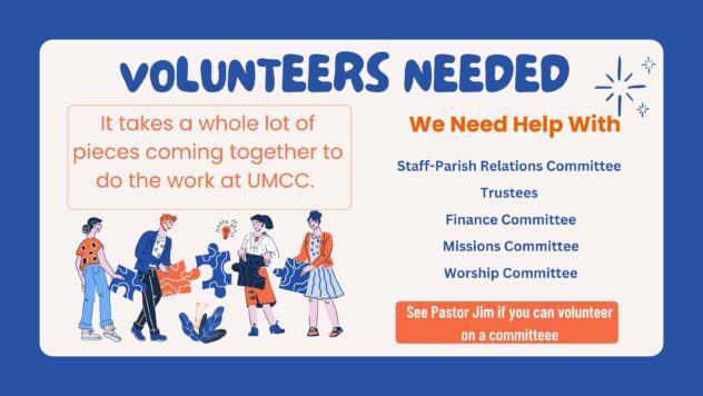 With “Charge Conference” (Our main administrative meeting) just around the corner, we’re looking to fill some vacancies on our committees. Please see Pastor Jim.